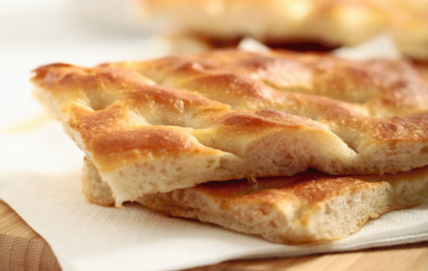 La fragrante focaccia ligure, dorata e croccante fuori, morbida dentro, esaltata dal sapore unico dell’olio extravergine d’oliva in perfetto connubio col sale.