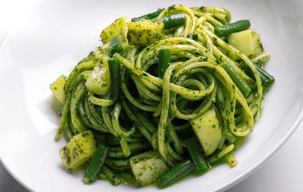 Un classico della nostra cucina. Le bavette al pesto (di nostra produzione), con fagiolini e patate, una versione arricchita della pasta con pesto genovese.